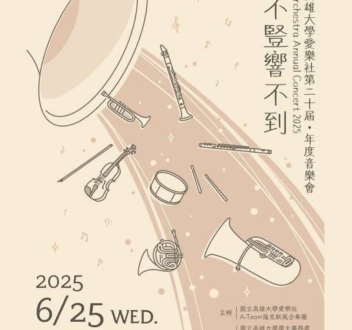 114年6月14日(六)舉辦自行車行車安全及維修講習,歡迎報名參加2025 年 5 月 27 日 93 6/25高大愛樂社2025年度音樂會《豎不豎響不到》售票演出 睜大眼睛、豎起耳朵 讓悠揚的樂聲響徹全場愛樂社2025年度音樂會《豎不豎響不到》即將在兩個月後到來 今年暑假,是高大愛月社踏出校園的第二度盛大展演,這一次,將在文化中心至德堂帶來豐富精彩的管樂、弦樂與鋼琴曲目!高大愛樂社2025年度音樂會《豎不豎響不到》日期 | 2025/6/25(三)時間 | 19:00開放入場 19:30正式演出地點 | 高雄市文化中心至德堂 本次售票方式採自由入座,快邀請家人親友一起來體驗這場音樂饗宴吧~購票方式請至Opentix網站(連結如下)!高大愛樂社期待您的蒞臨https://www.opentix.life/event/1914525885089779713 nukadmin Related posts2025 年 5 月 27 日114年6月14日(六)舉辦自行車行車安全及維修講習,歡迎報名參加Read more2025 年 5 月 12 日114年度高雄大學校友總會旅遊活動Read more2025 年 4 月 28 日高大學生會活動-牧野狂歡・舞後的夏祭 歡迎參加Read more Comments are closed.