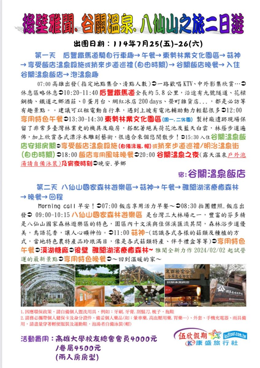 國立高雄大學校友總會為促進校友間之交流與情誼,特訂於 114年7月25日(五) – 26日(六)舉辦「高雄大學校友聯誼之旅~谷關溫泉.八仙山二日遊」,歡迎報名參加。